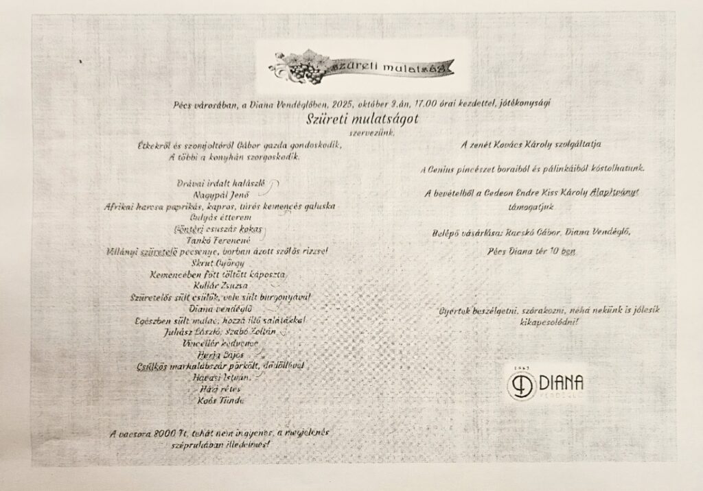 2025. október 3-án, pénteken 17:00 órától egy igazi, hagyományőrző szüreti esten veszünk részt Pécsen, a Diana Vendéglőben 🎶🥘